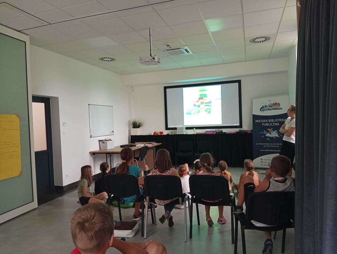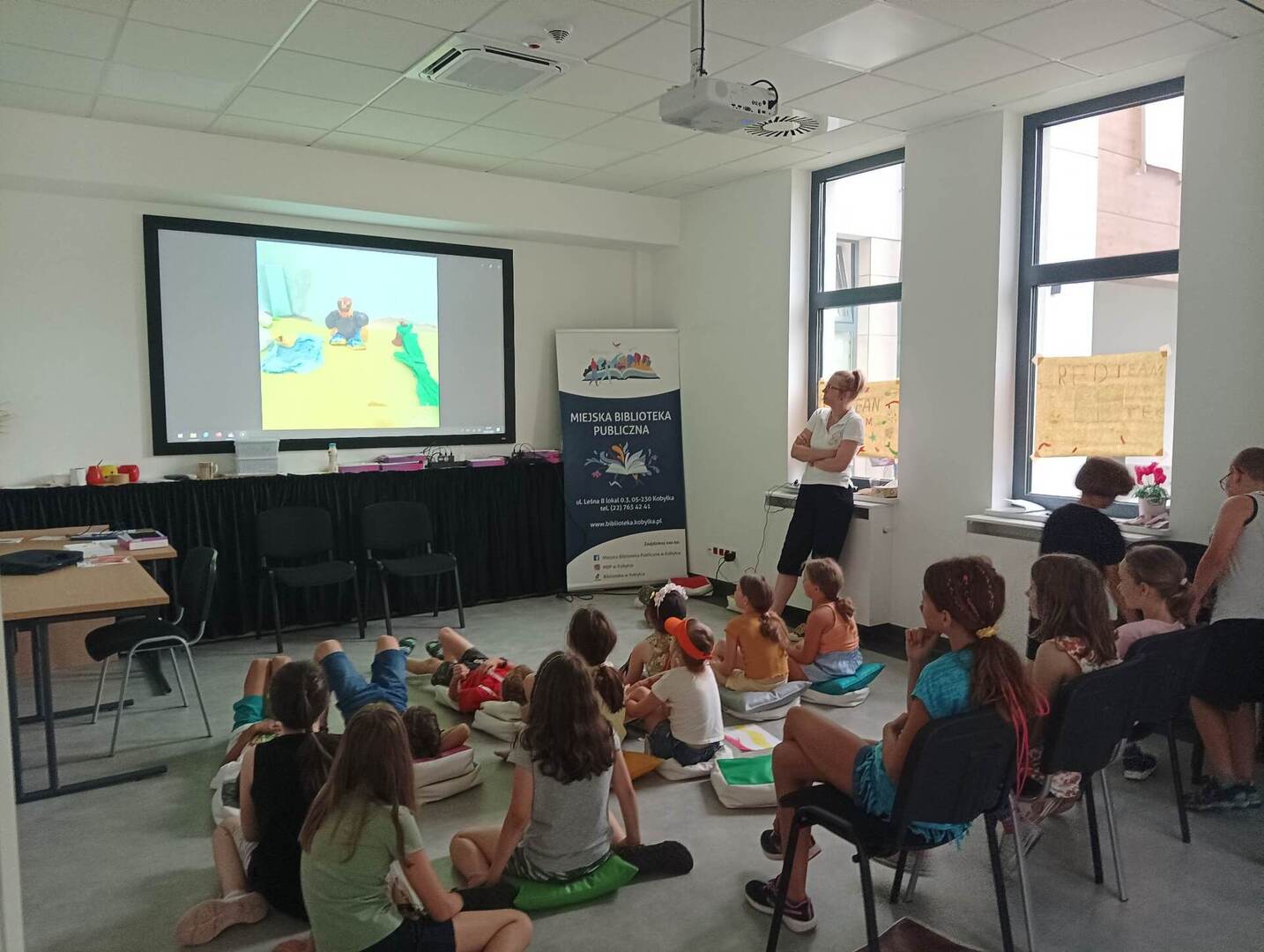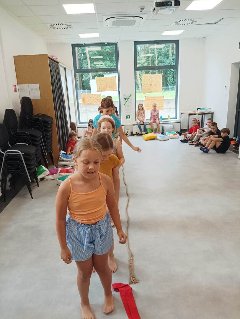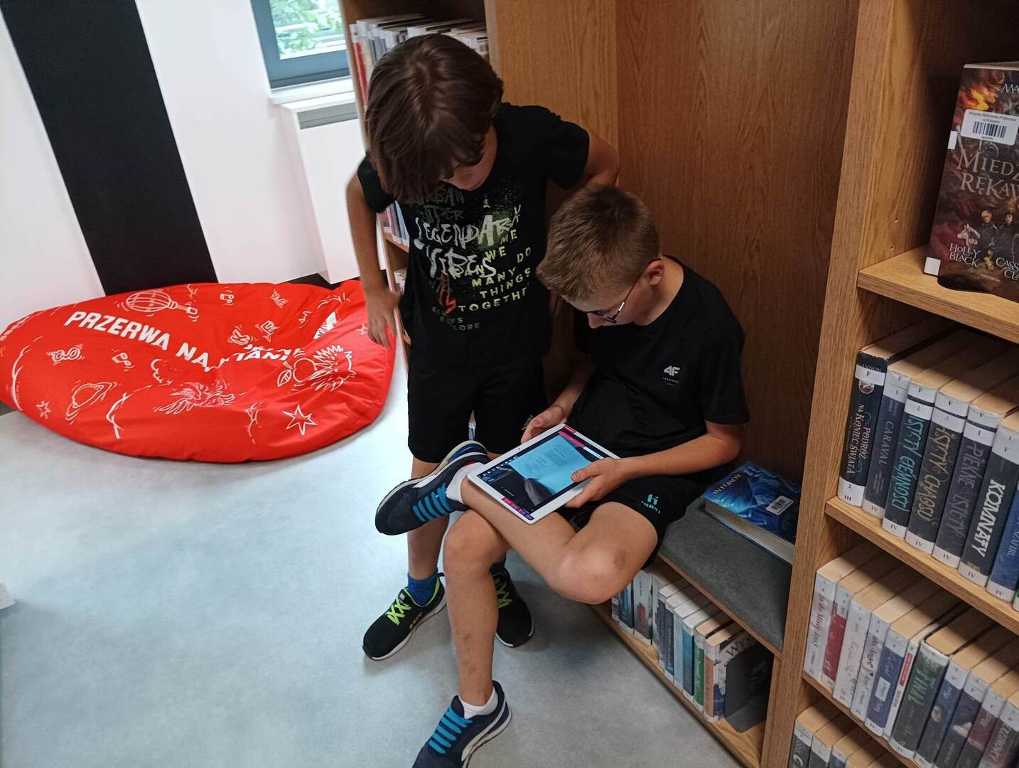 Za na mi przedostatni dzień półkolonii pod hasłem „Okno na innowacje”. Zajęcia rozpoczęły od zabaw ruchowych i gimnastyki umysłowej (ćwiczeń na spostrzegawczość). Odbyła się również projekcja filmów wykonanych przez uczestników metodą poklatkową. Dzieciaki zapoznały się również z aplikacją Tik-Toka. Każdy z zespołów miał za zadanie nagrać Tik-Toka dotyczącego : czytania, książek lub tego co można robić w bibliotece.