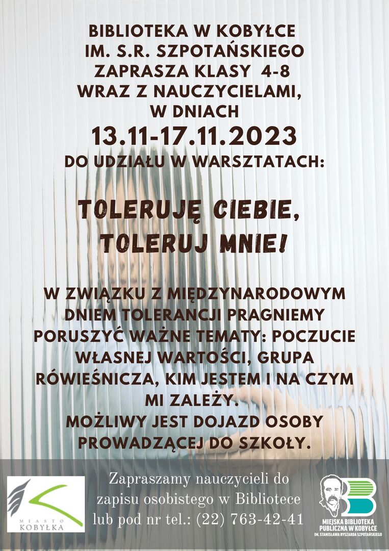 16 listopada obchodzimy Międzynarodowy Dzień Tolerancji. W związku z tym, w dniach 13-17 listopada, Biblioteka zaprasza Szkoły Podstawowe do udziału w bezpłatnych warsztatach przygotowanych dla dwóch grup wiekowych: klasy 1-3 oraz 4-8. Zapraszamy nauczycieli do zapisu osobistego lub pod numerem telefonu: (22) 763-42-41. Szczegóły na plakatach.