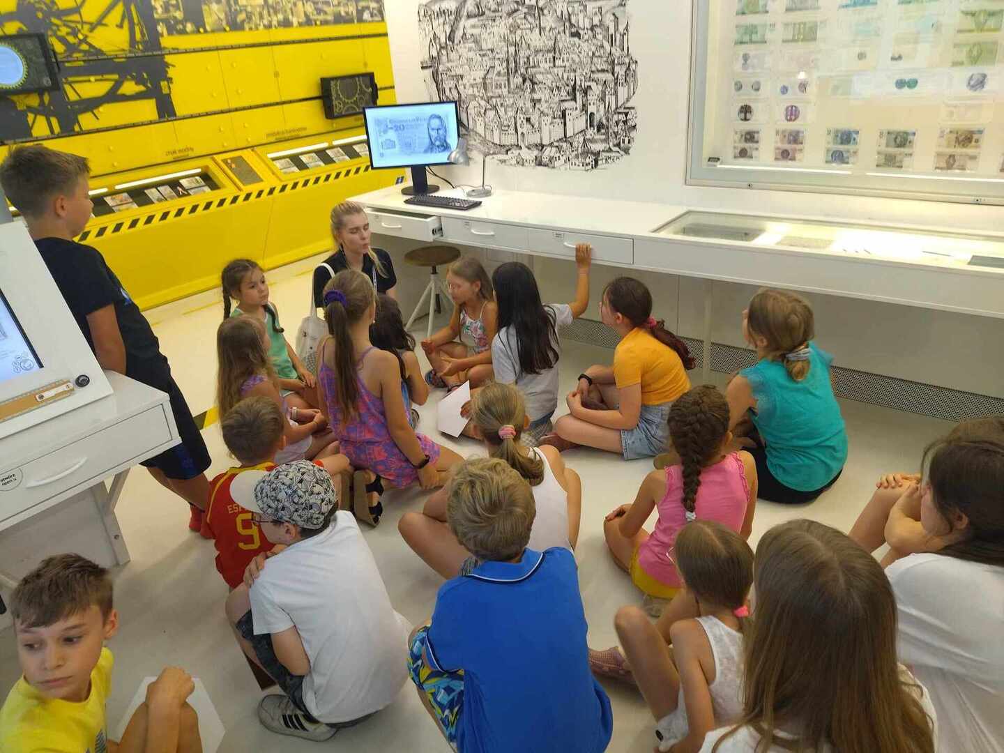 Czas niesłychanie szybko płynie i tak oto połowa pierwszego turnusu półkolonii "Grosz do grosza" już za nami. W środę odwiedziliśmy Centrum Pieniądza NBP im. Sławomira S. Skrzypka w Warszawie. Pomimo upału energia rozpierała młodych entuzjastów pieniędzy. Na miejscu uczestniczyliśmy w warsztatach: „Na tropach złotego” przygotowanych specjalnie dla placówek uczestniczących w akcji „Lato w Mieście 2024”. Poznaliśmy historię polskiego pieniądza od pierwszego denara Bolesława Chrobrego aż do czasów obecnych. Mieliśmy możliwość zobaczyć jak powstaje banknot oraz różne sposoby zabezpieczeń przed fałszerstwem. Niemałą atrakcją była 12-kilogramowa sztabka złota, którą uczestnicy mogli potrzymać w ręku.