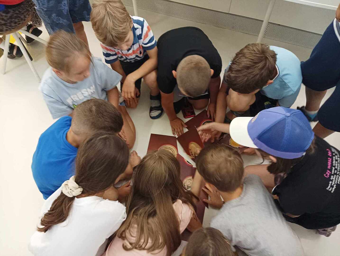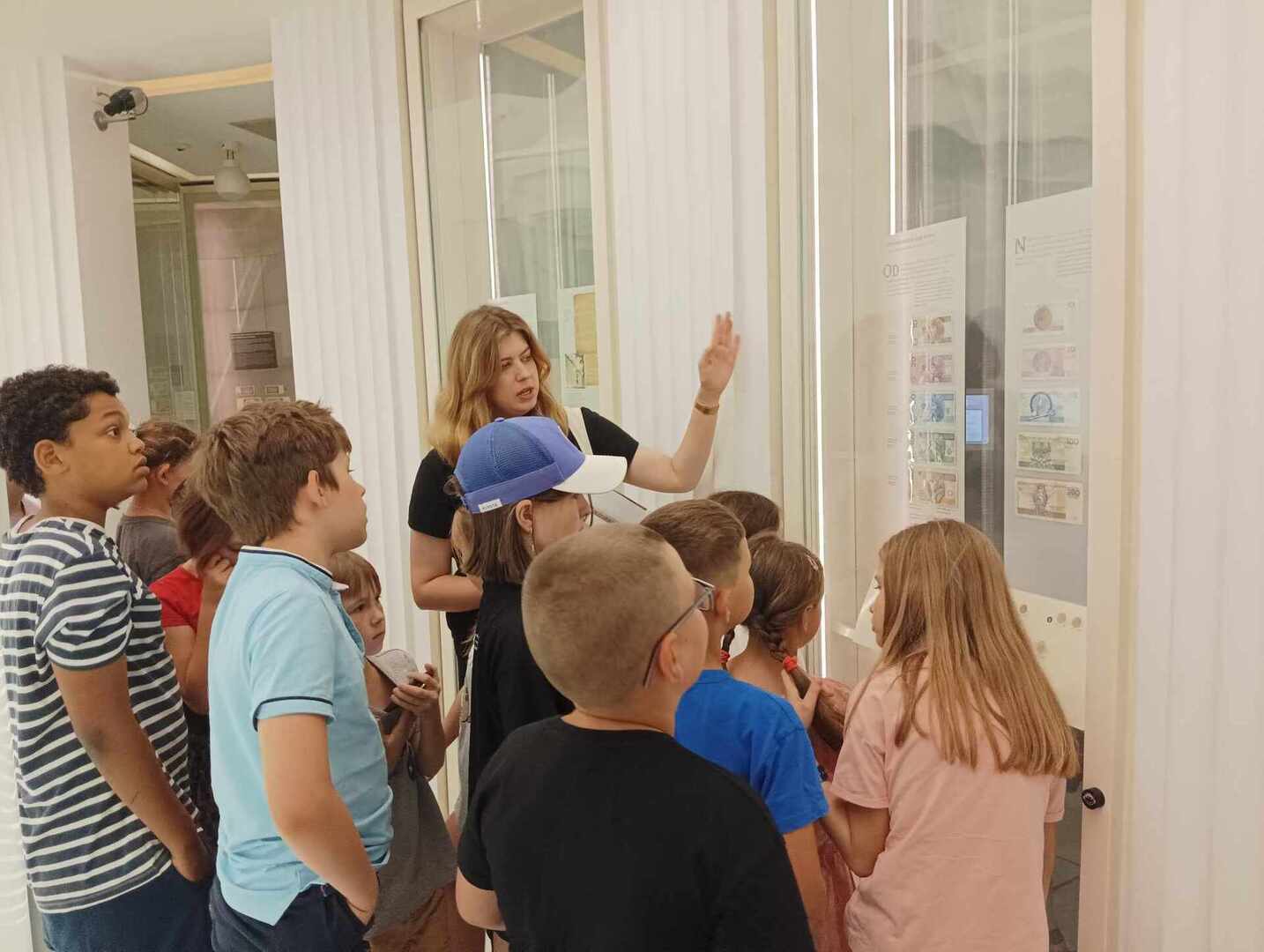 Czwartego dnia naszych półkolonii "Grosz do grosza", dzięki wsparciu naszego partnera Bank Pekao S.A. oraz pomocy Niedajsienudzie NGO Kobyłka udaliśmy się do Centrum Pieniądza NBP im. Sławomira S. Skrzypka w Warszawie. Dzieci uczestniczyły tam w warsztatach „Na tropach złotego” przygotowanych specjalnie dla placówek uczestniczących w akcji „Lato w Mieście 2024”. Oczywiście rebusy i zagadki nie stanowiły przeszkody dla naszych "doświadczonych finansistów" i udało się im zgromadzić wszystkie elementy układanki. Dużą atrakcję stanowiła sztabka złota, którą jak się okazało wcale nie tak łatwo było podnieść- zwłaszcza jedną ręką. Po powrocie jeszcze zdążyliśmy dokonać wypłaty i była chwilka na ostatnie zakupy w "Mini-markecie".
