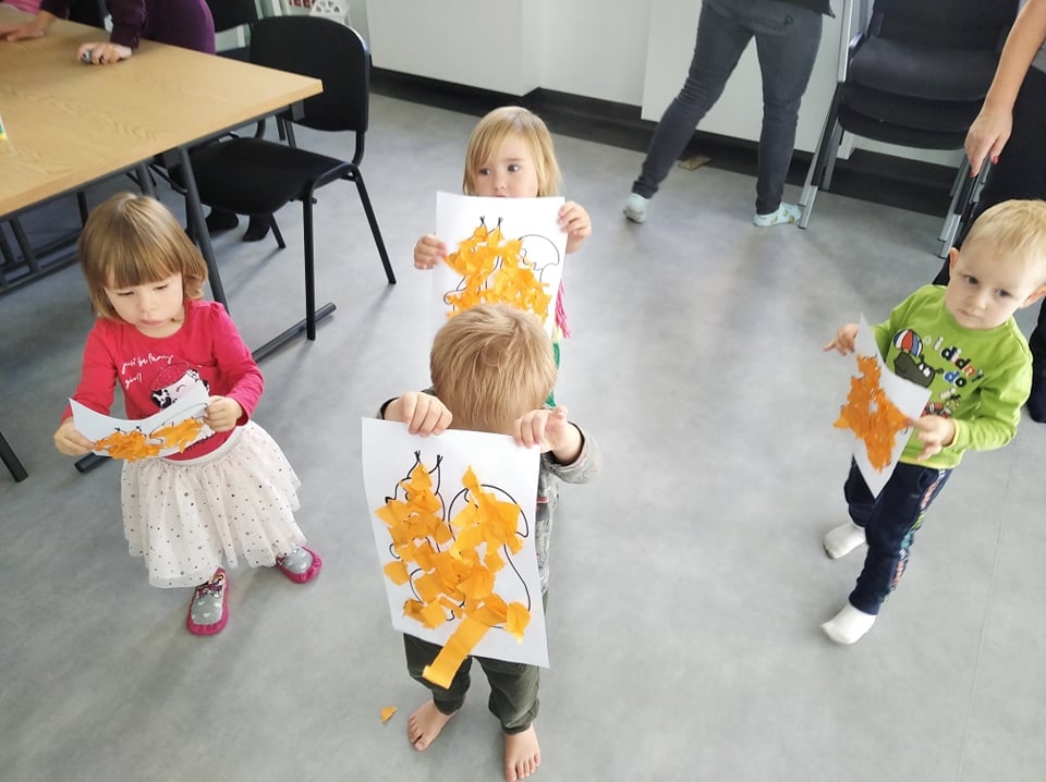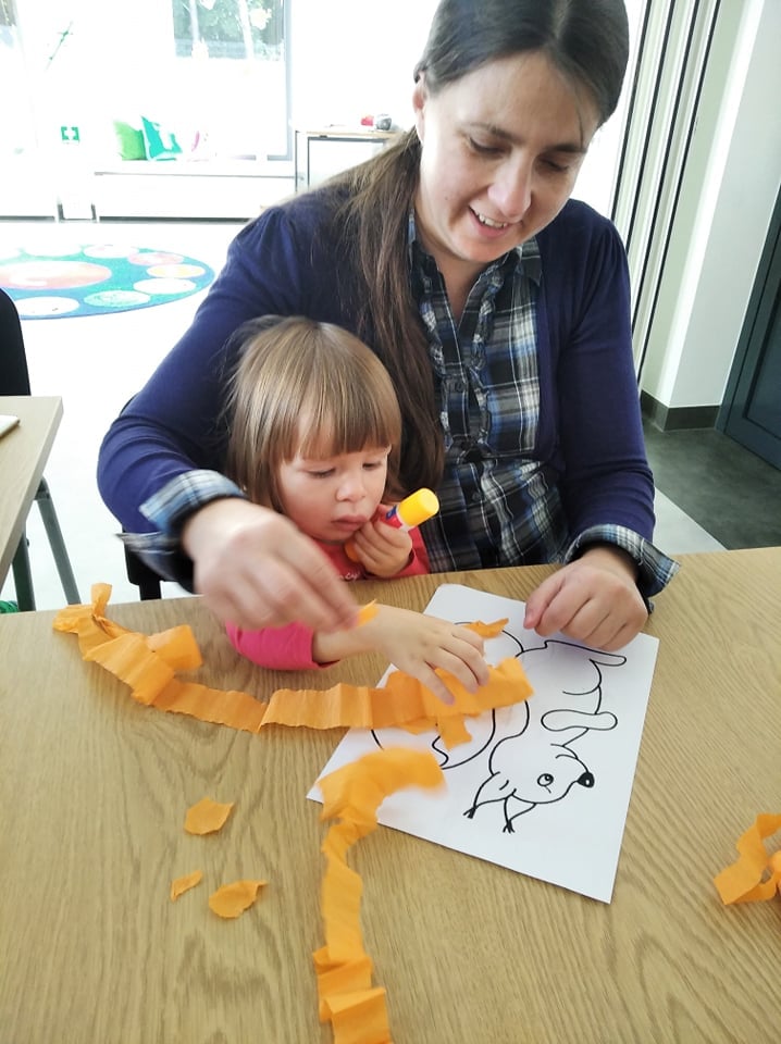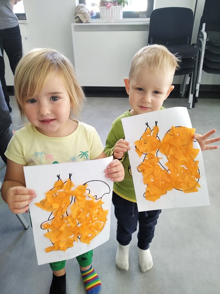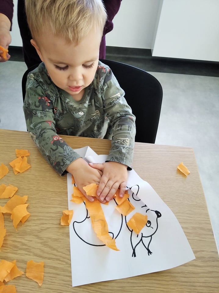 Dziś wraz z Niedźwiadkiem Opowiadkiem rozpoczęliśmy cykl zajęć o zwierzętach leśnych- maluchy poznały wiewiórkę Rudusia. Dzieci dowiedziały się gdzie wiewiórki mieszkają i co lubią jeść . Na zakończenie wykleiliśmy szablon wiewiórki pomarańczową krepiną.