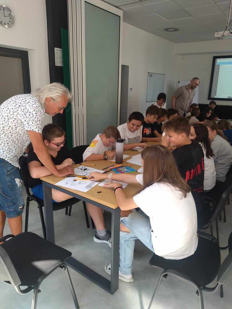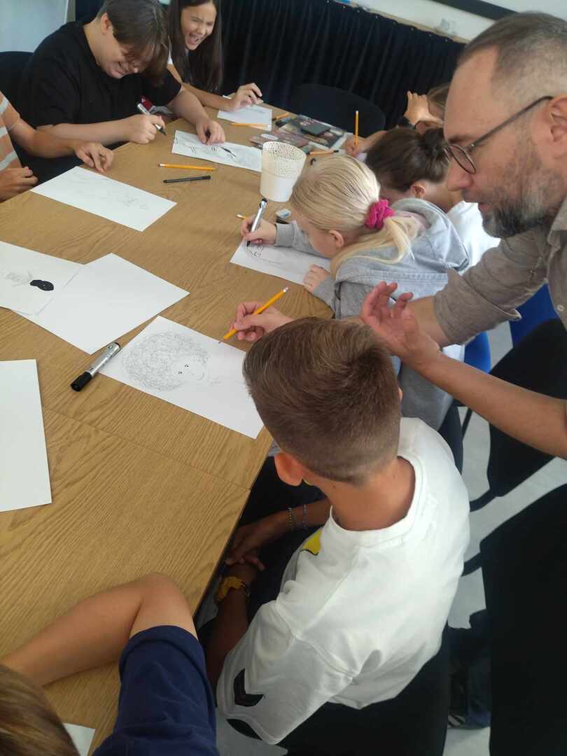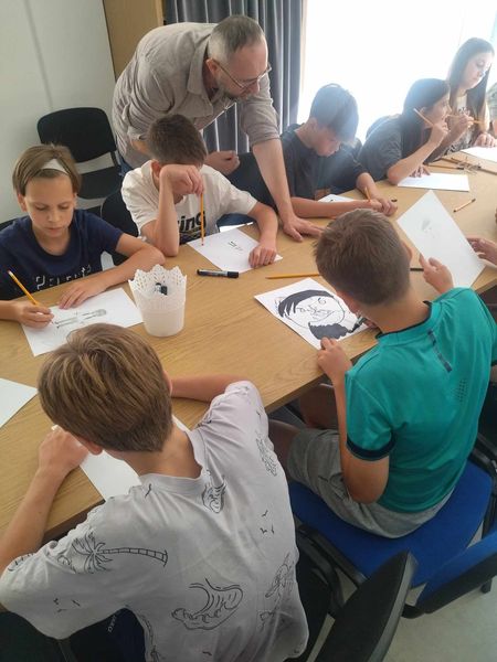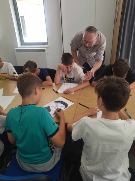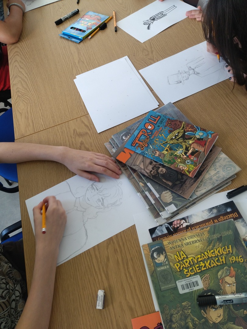 Warsztaty dla dwóch klas 7 ze Szkoły nr 2 w Kobyłce poprowadził Hubert Ronek, który w swoim dorobku ma tysiące plansz komiksowych i rysunków, publikacje w albumach, antologiach, podręcznikach, magazynach i prasie (głównie dla młodszych czytelników, np. "Kumpel", "Victor Junior", czy "Hop i Siup").