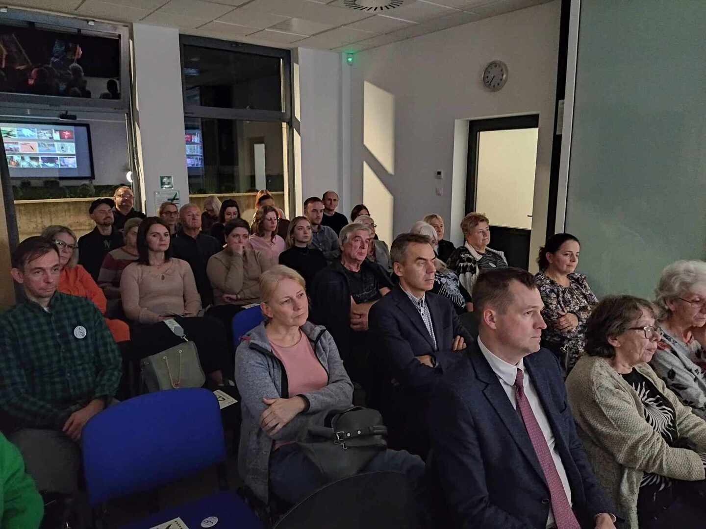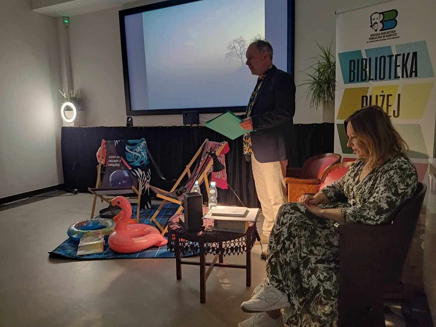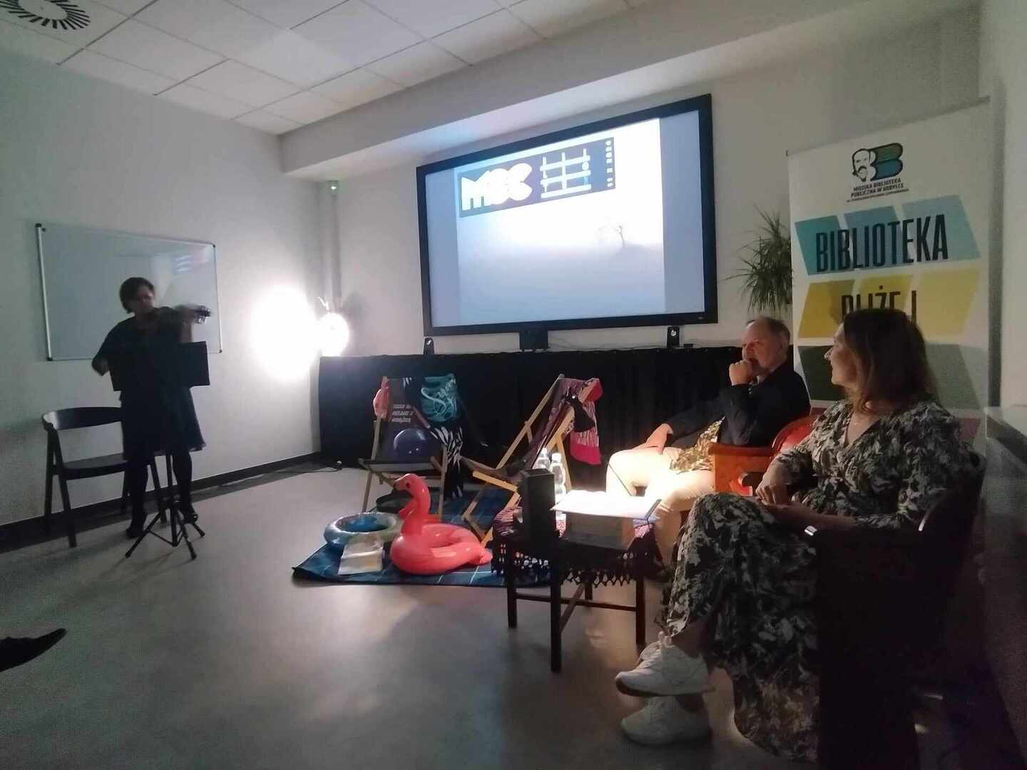 O 19:30 dorośli czytelnicy mogli wziąć udział w Lokalnym Spotkaniu z OBRAZEM, SŁOWEM i DŹWIĘKIEM (KLiN). Wyświetliliśmy filmy „Miejsce” oraz „Plaża”, a muzykę na żywo skomponowaną przez Jerzego "Dudusia" Matuszkiewicza odegrała niezwykła Dominika Karwowska z