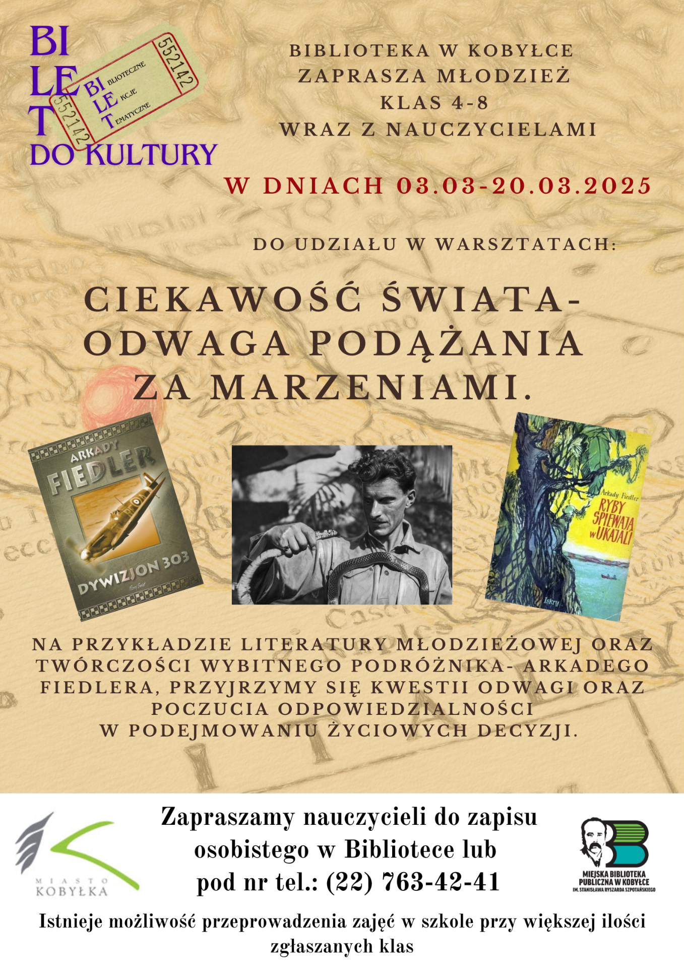 Zapraszamy klasy 4-8 szkół podstawowych na kolejne bezpłatne warsztaty z cyklu "Bilet do Kultury". Tym razem zajmiemy się kwestią odwagi i poczucia odpowiedzialności. Każdego dnia stajemy w obliczu wyborów, podejmowania decyzji. Przeważnie są to drobne sprawy, lecz przychodzą takie chwile, kiedy ważą się losy naszej przyszłości. Często chcemy sami decydować, nie słuchamy rad i namów innych, a bywa też odwrotnie. Czasem czynimy to pochopnie i pod wpływem impulsu. Nie zawsze nasze decyzje są słuszne i co wtedy?