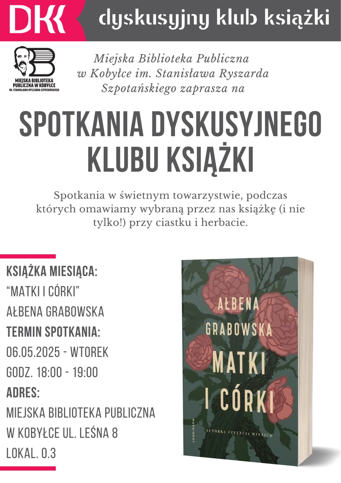 Po majówce, 6 maja, zapraszamy na kolejne spotkanie Dyskusyjnego Klubu Książki dla dorosłych! Książką miesiąca zostały "Matki i córki" Ałbeny Grabowskiej.