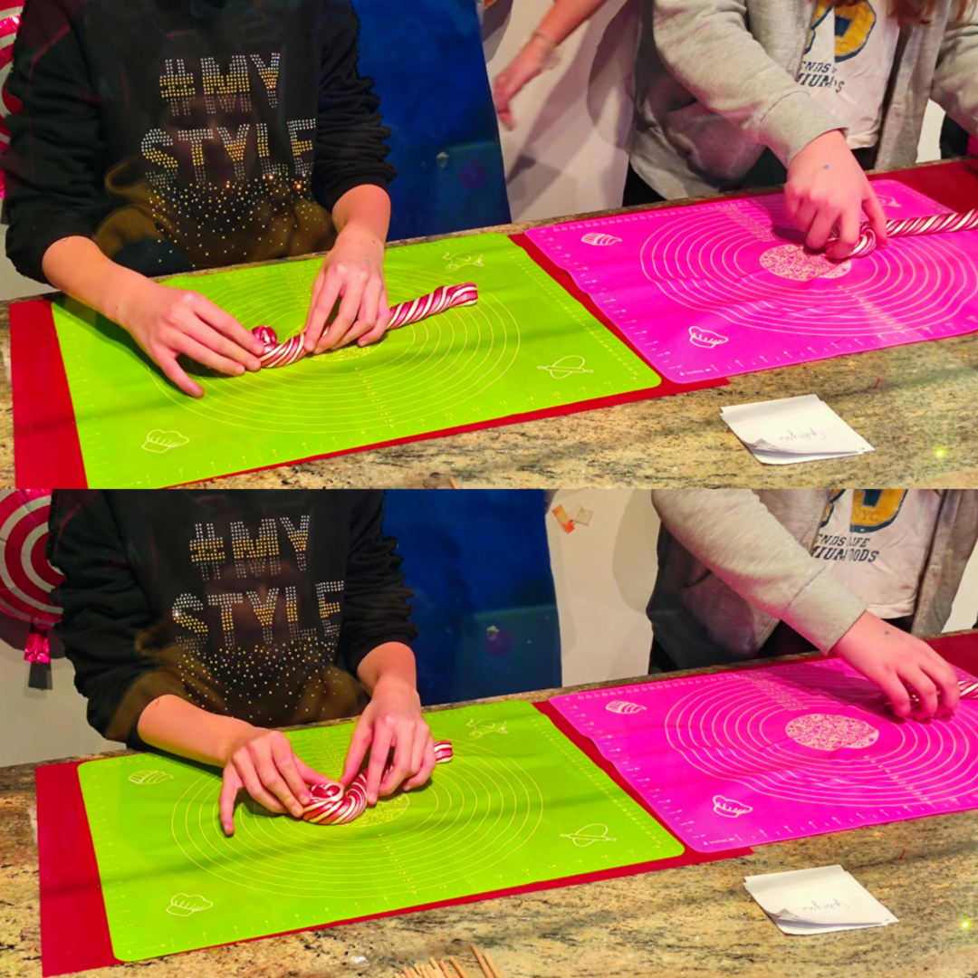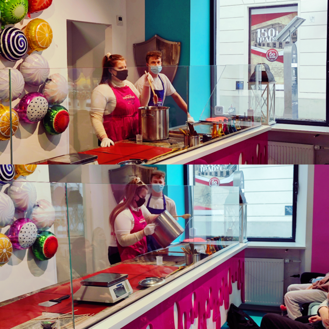 Wspaniały zapach i moc słodyczy stworzyły pyszną atmosferę. Dzieci miały możliwość zobaczyć cały proces powstawania cukierków i lizaków od momentu wylania gorącego karmelu na stół po złożenie całego wzoru lizaka.