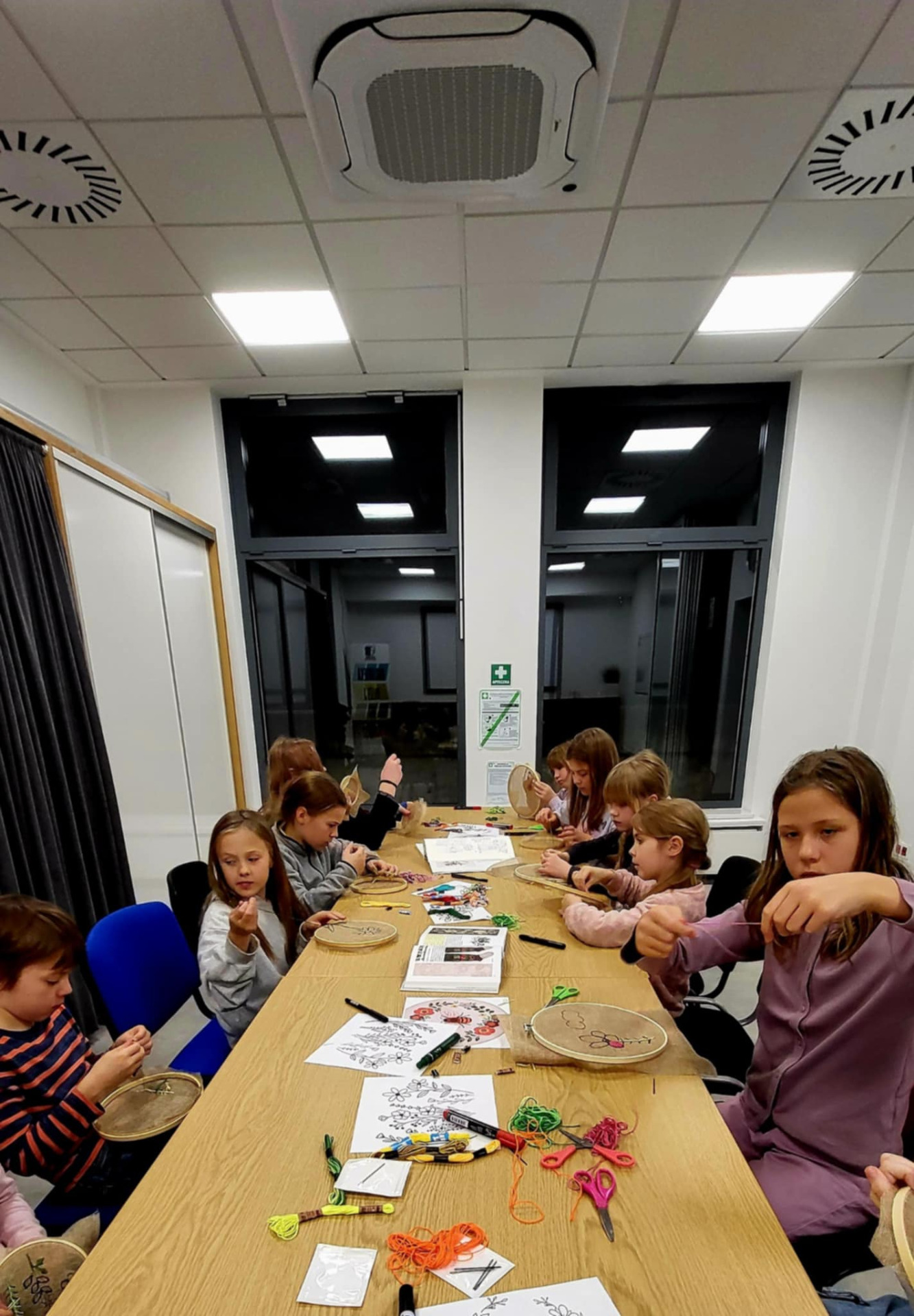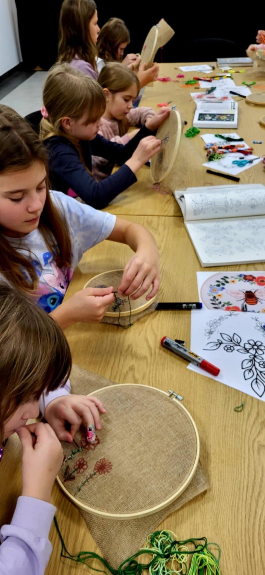Dzieci z ciekawością i zaangażowaniem stawiały pierwsze kroki w tej pięknej sztuce. Użyliśmy bezpiecznych, nieostrych igieł, żeby sprawdzić, czy nasi mali artyści potrafią z nich korzystać w sposób bezpieczny i uważny.