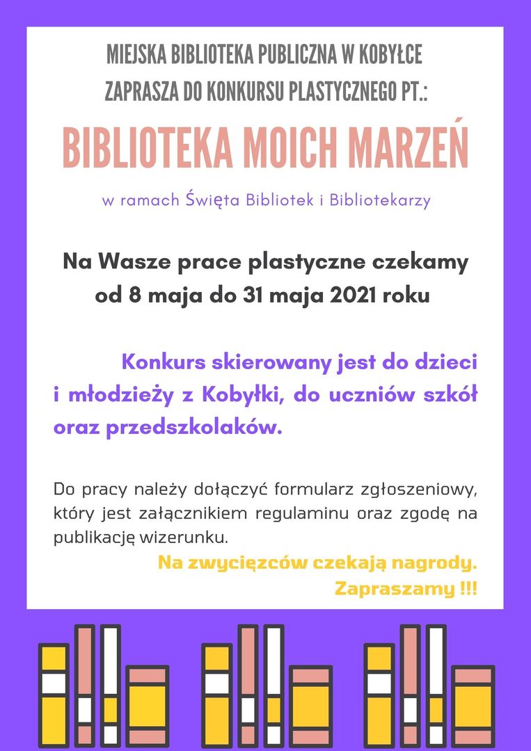 Konkurs plastyczny pt.: "Biblioteka moich marzeń", powstał w ramach Święta Bibliotekarzy i Bibliotek w celu promocji czytelnictwa, rozbudzania i kształtowania wyobraźni dzieci, utrwalania wizerunku Biblioteki jako miejsca przyjaznego dzieciom i młodzieży.