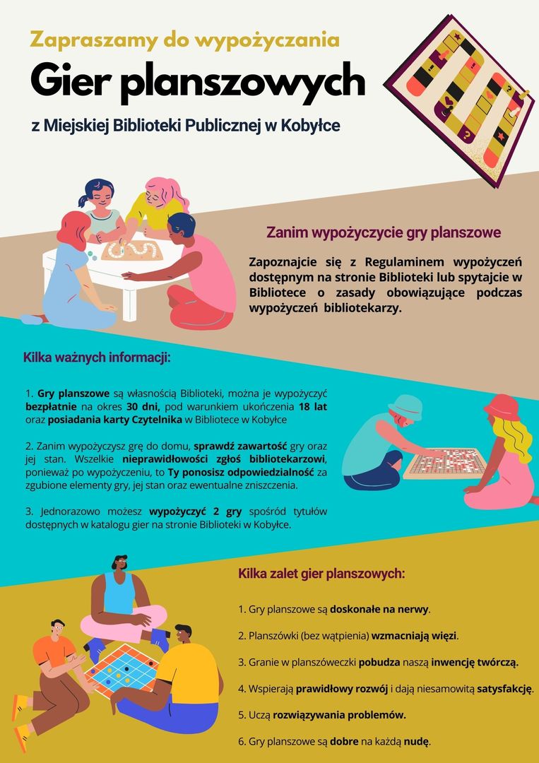 - Gry planszowe są własnością Biblioteki, można je wypożyczyć bezpłatnie na okres 30 dni, pod warunkiem ukończenia 18 lat oraz posiadania karty Czytelnika w Bibliotece w Kobyłce