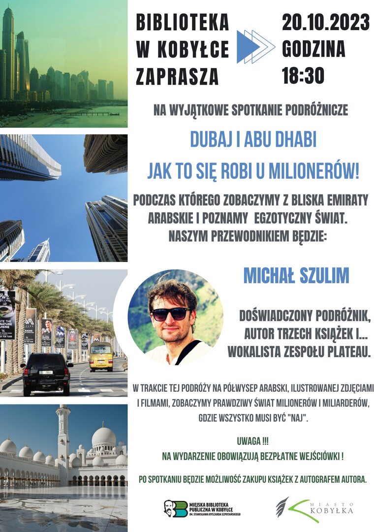 Zapraszamy 20 października - piątek - na wyjątkowe spotkanie podróżnicze, podczas którego zobaczymy z bliska Emiraty Arabskie i poznamy egzotyczny świat. Naszym przewodnikiem będzie Michał Szulim - doświadczony podróżnik, autor trzech książek i... wokalista zespołu PLATEAU.